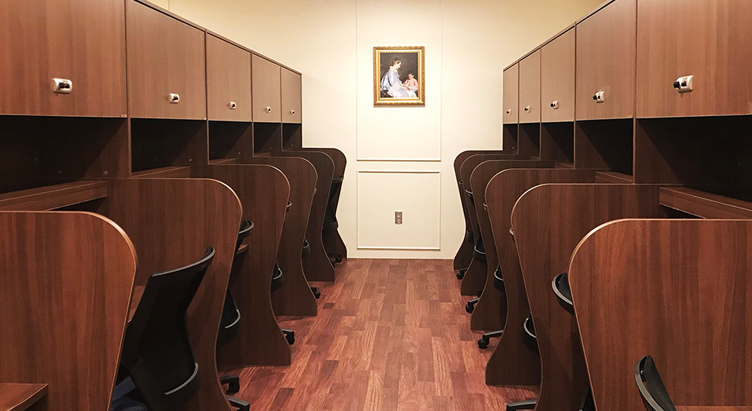 영국의 옥스퍼드 대학의 학습 공간을 콘셉트로 낮은 칸막이가 답답한 시야를 트여주면서 서로의 학습내용이 보이지 않도록 디자인된 공간입니다.