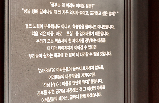 작심의 공간 노하우가 집약된 개방적인 분위기의 카페에서 다과와 차한잔의 여유를 느끼며 공부의 호흡을 유지할 수 있는 공간입니다.