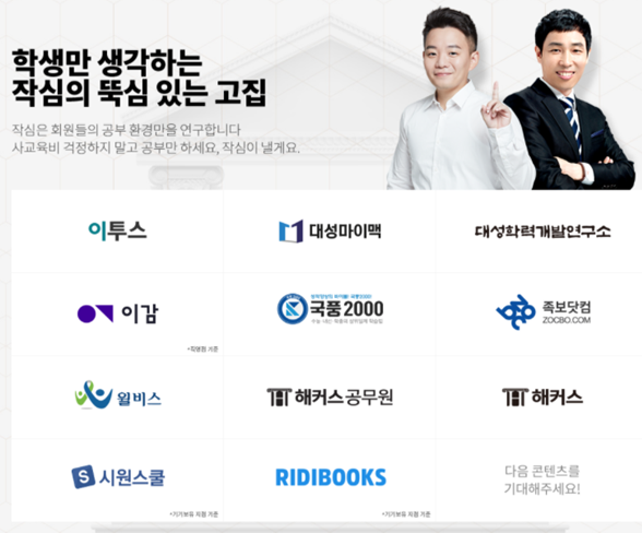 실제로 작심은 이투스, 대성마이맥, 윌비스, 해커스 등 업계 선두 기업 11곳과 제휴를 맺어 작심독서실·스터디카페 이용자들에게 최신 인강을 무료로 제공해주고 있다. 업계 측이 제공한 자료에 따르면 작심은 올해 11월 말 기준 교육콘텐츠 서비스 이용자 수 102,249명을 달성하였고, 누적 혜택 금액은 30억 원에 육박한다.