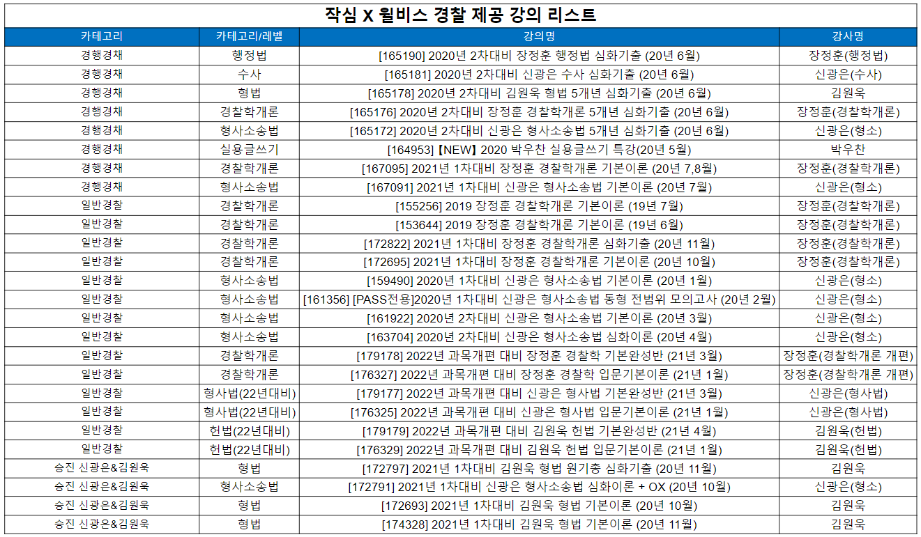 [교육콘텐츠] 작심 제공 윌비스 경찰 강좌 목록 (2021년 08월 기준)