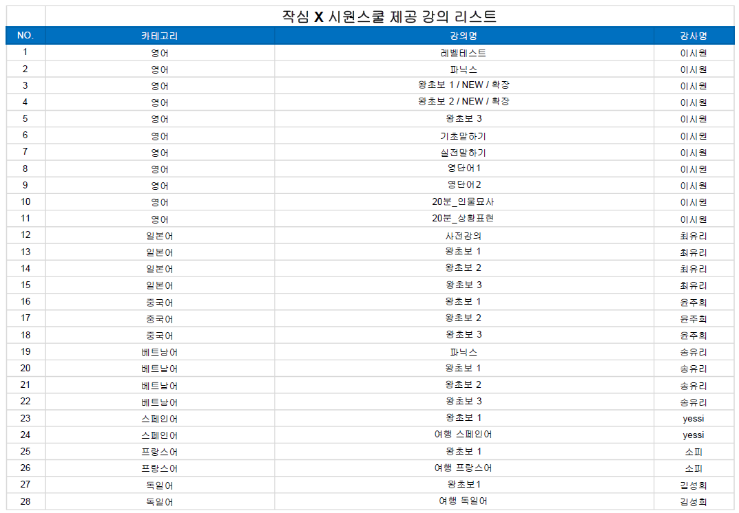 [교육콘텐츠] 작심 제공 시원스쿨 강좌 목록 (2021년 01월 기준)